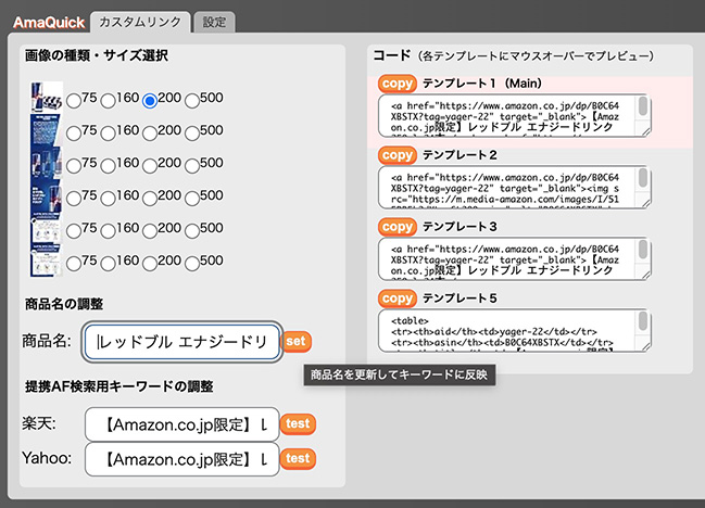 Amazonの商品ページから取得した商品名には、SEOを意識した不要なテキストが含まれている場合があります。v6.0.2では、「商品名の調整」欄で商品名を編集し、調整した商品名を楽天・Yahoo!ショッピング用の検索キーワードやテンプレートに反映できるようになりました。